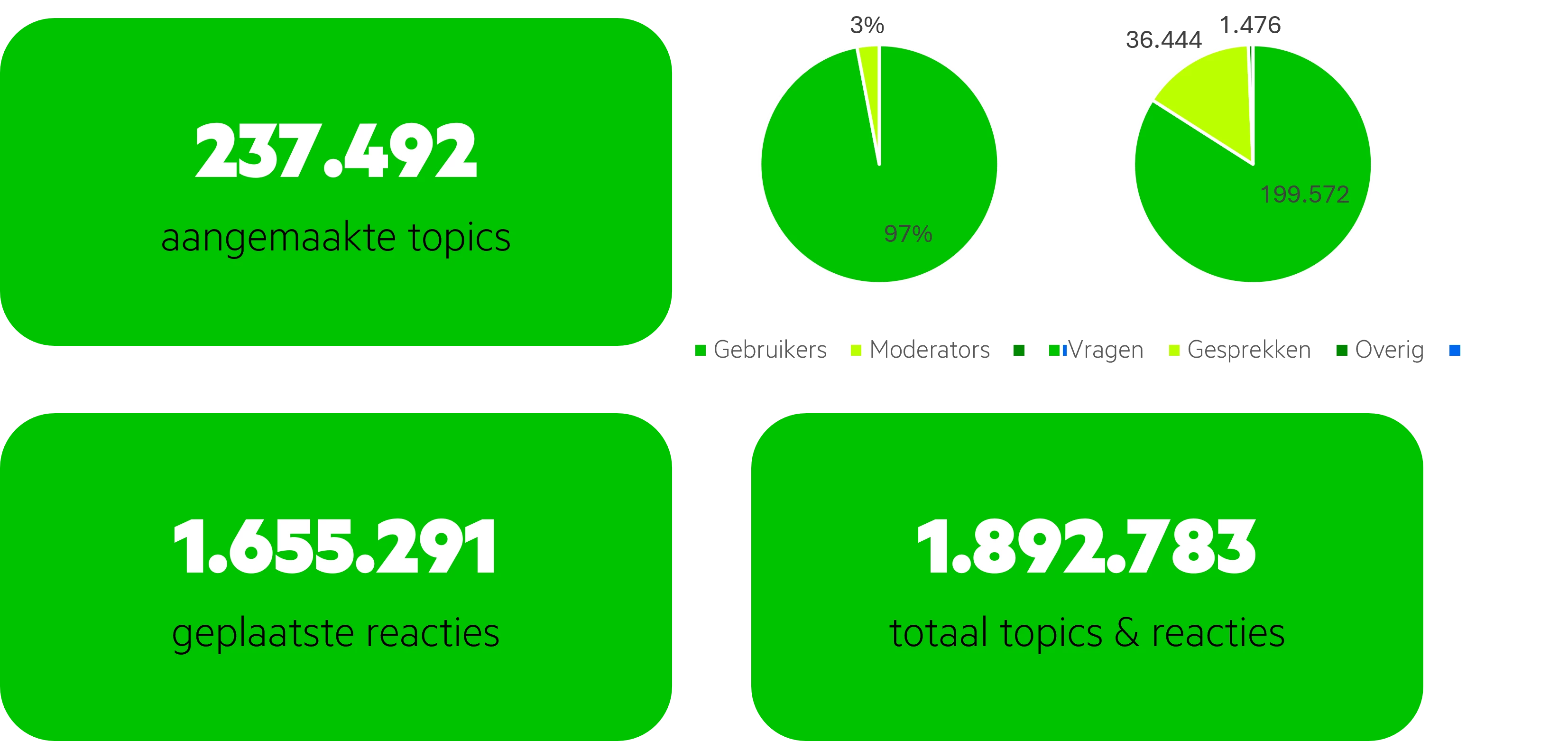 Wij, maar vooral jullie, de communityleden, zijn een stel kletskousen. In het afgelopen anderhalve decennium zijn er bijna twee miljoen berichten geplaatst. Hieronder zie je hoe deze berichten zijn verdeeld tussen topics en reacties, gebruikers en moderators, en vragen en gesprekken.