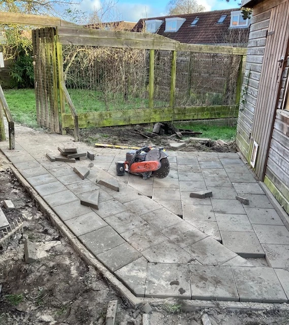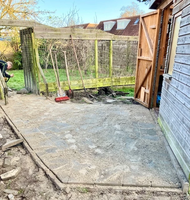Ik had een bekende tuinman al eerder  gevraagd of hij een tegelpad van het hok naar het tegelpad voor wilde maken, wat hij dus van de week deed.