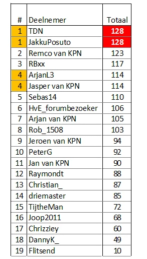 Van mij kregen​ ​@JakkuPosuto (7), ​@Sebas14 (7)@ArjanL3 (4) en ​@Remco van KPN (2 punten)
