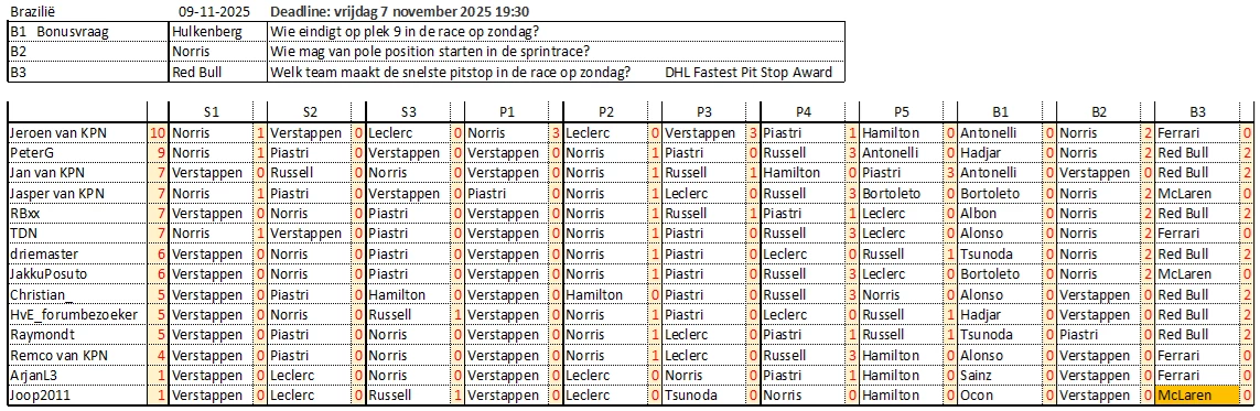 Brazilie is dit weekend. Weer een sprintweekend, dus vroege deadline voor de voorspellingen. Het race weekend is trouwens voor een groot deel  gratis te bekijken: https://www.totaaltv.nl/nieuws/viaplay-toont-formule-1weekend-vrijwel-geheel-gratis-op-viaplay-tv-/ Alleen voor de hoofdrace is een betaalde optie noodzakelijk.