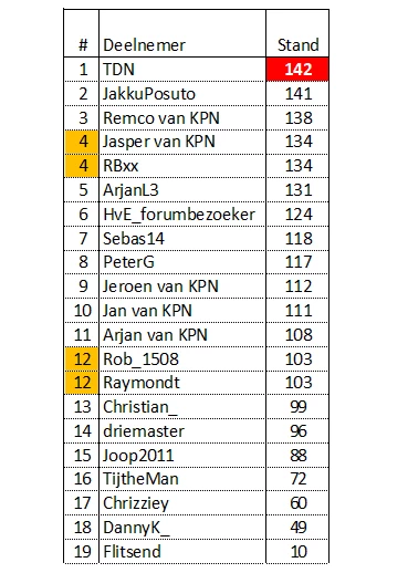@Remco van KPN ​@Raymondt ​@RBxx ​@joop2011 ​@Jasper van KPN ​@Jeroen van KPN ​@Jan van KPN ​@JakkuPosuto ​@driemaster ​@DannyK_ ​@TijtheMan ​@TDN ​@Christian_ ​@PeterG ​@driemaster ​@ArjanL3 ​@Arjan van KPN ​@HvE_forumbezoeker ​@Sebas14 ​@Flitsend