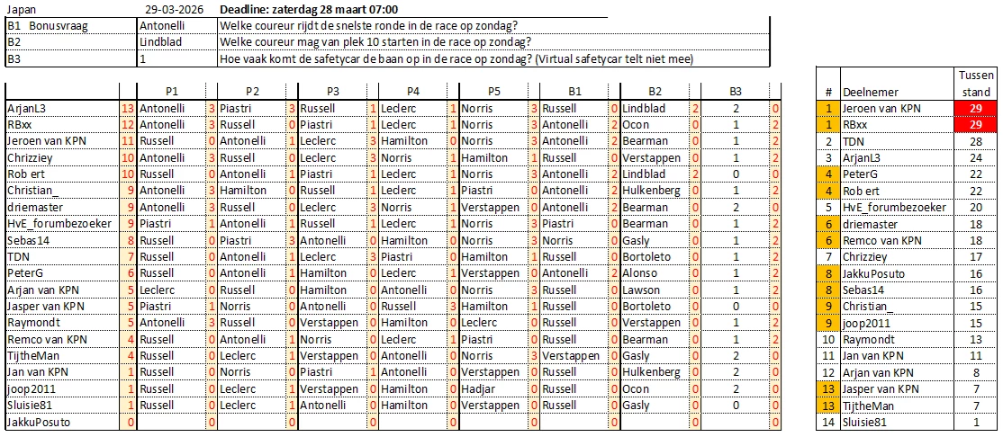 Hierbij de details van de uitslag van de KPN F1 competitie inclusief de tussenstand ná GP Japan.