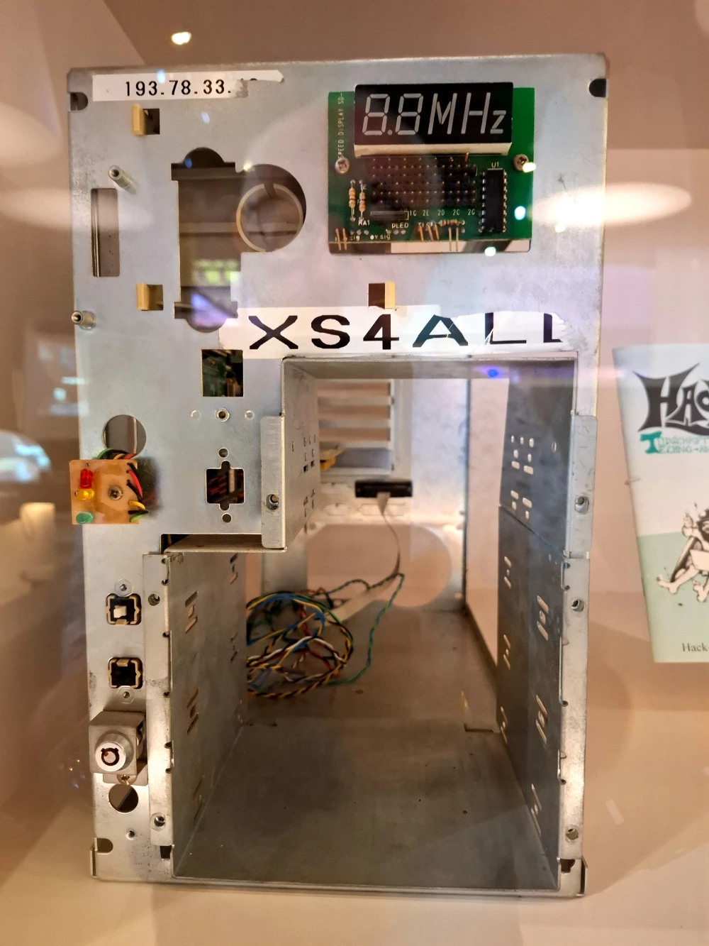 Gisteren was ik met een klein groepje vrienden bij Beeld en Geluid te Hilversum. Veel van de beschikbare ruimte is gevuld met de modernste elektronica en digitale technieken. Met een speciale app op je telefoon kun je veel games spelen, digitale trucjes uithalen en verbanden leggen. Heel leuk allemaal maar dit is niet waarom wij gingen. Ons groepje ging meer voor de nostalgie en ook dit is volop aanwezig. Mijn hart maakte een sprongetje bij de vitrine met ‘communicatiemiddelen’ uit vervlogen tijden. Hier stond oa. een PC frame uit de XS4ALL tijd en een uitgave van het blad Hack-Tic.  Het getoonde gekannibaliseerde computerframe symboliseert voor mij de huidige status van XS4ALL: Een leeg frame met enkel nog wat losse draden en niet meer functionerende knoppen, schermpjes en schakelaars.