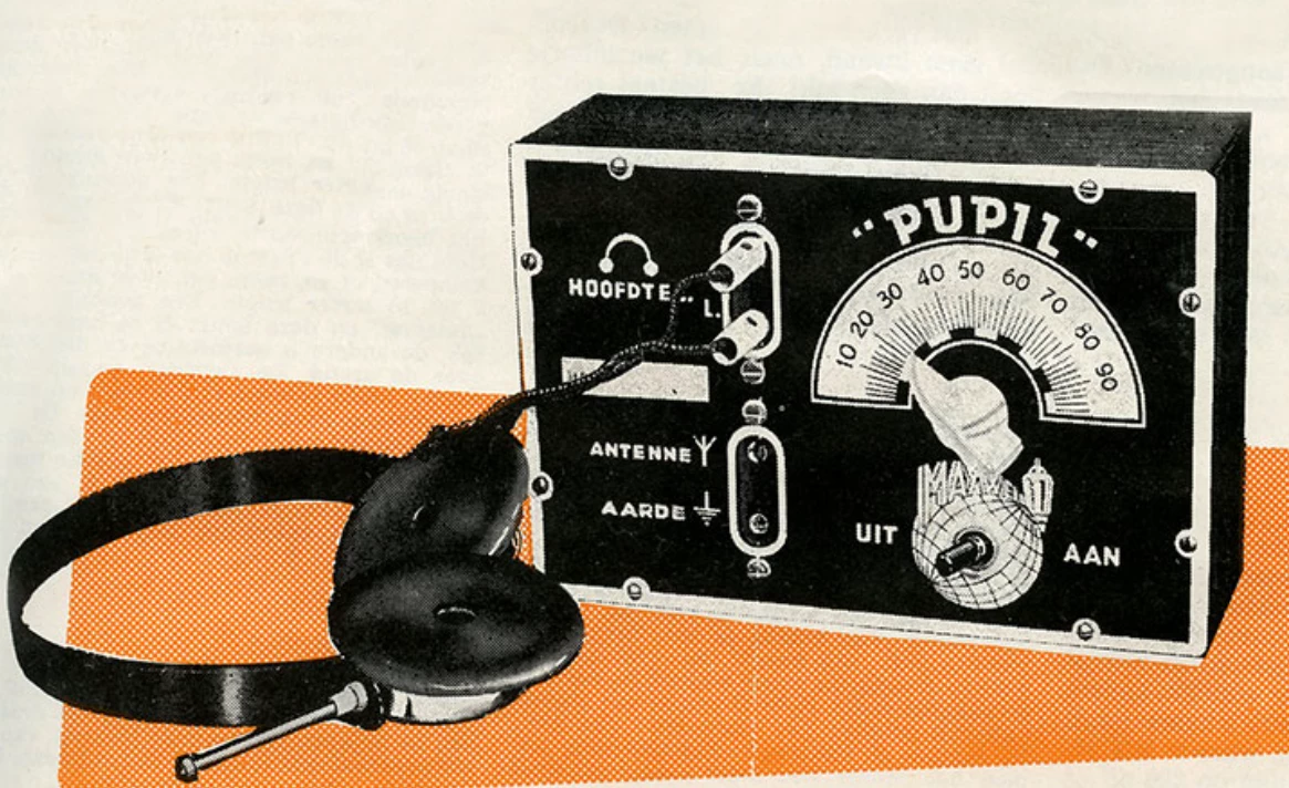 Op mijn zolderkamertje in elkaar geknutseld, de Maxwell Pupil. De ‘aarde’ werd niet benut voor zover ik mij herinner, de antenne uiteraard wel, anders was er niets te horen. Dit was bij mij een lang stuk ijzerdraad die door het bovenraam van de zolderkamer naar de kersenboom liep die voor ons huis stond. Hier hing een eigengemaakte ‘raamantenne’, gemaakt met de draad uit een spoel (de stator) van een gesloopte fietsdynamo. Op de blokbatterij van 15 volt moest je zuinig zijn, dat was op de buis na het duurste onderdeel van de Maxwell. Het geheel was onderdeel van een radio zelfbouw cursus. Welke golflengte de afstemcondensator bestreek weet ik niet meer, maar het gepiep en gefluit was niet van de lucht, het moet de korte golf geweest zijn.