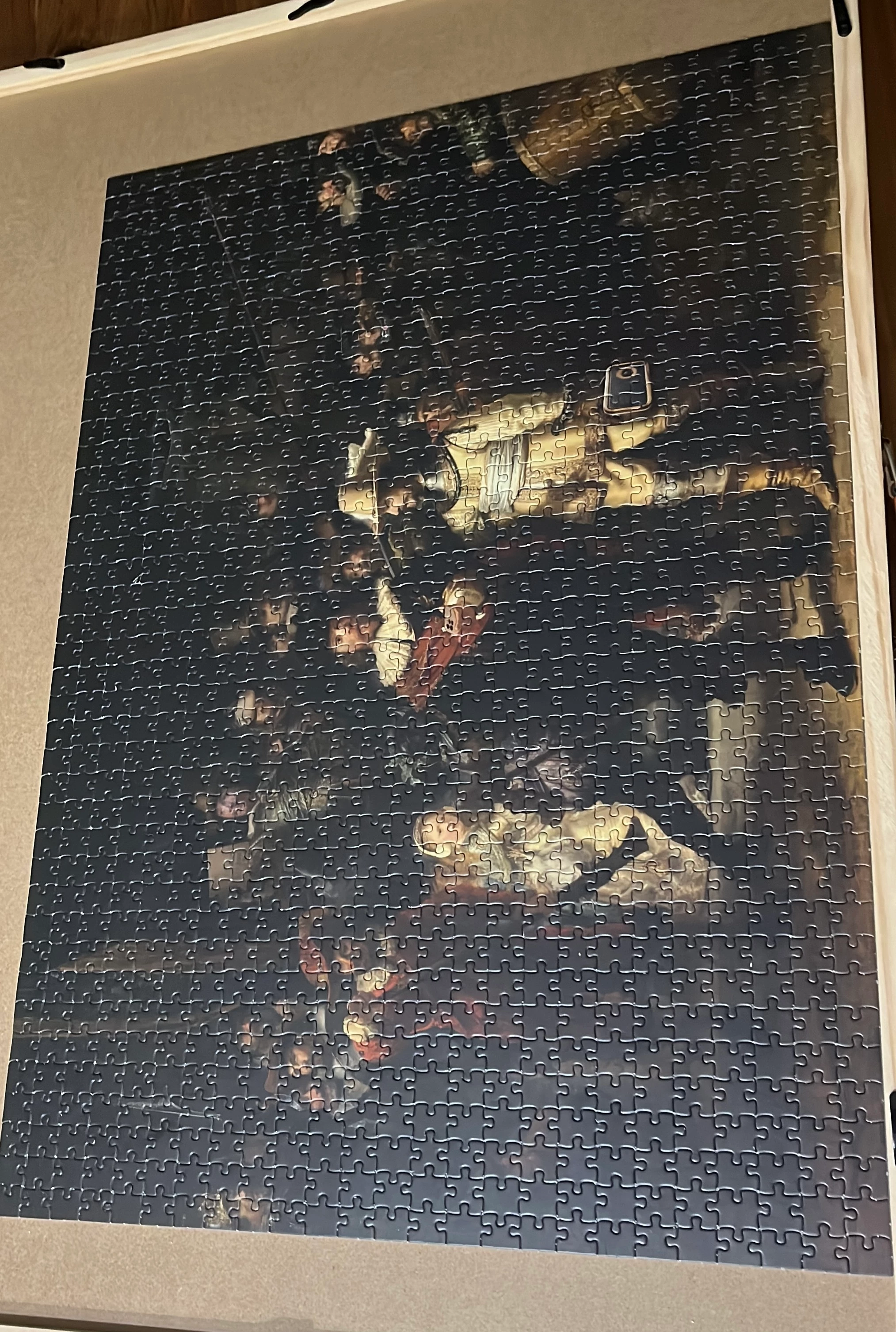 Tot nu toe hebben we geen slecht gesneden of beschadigde stukjes gevonden. Het is inderdaad een donkere puzzel, maar dat maakt het extra passend bij een kunstwerk als de Nachtwacht, toch? (roept ze heel enthousiast, want het is wel erg donker...)