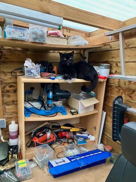 Ik zocht een stuk gereedschap in het hok, Tijger zocht mee.
