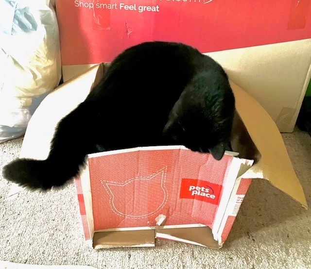 Tijger is nieuwsgierig en wil weten wat er in de doos zit, daarom is ze een gedegen onderzoek gestart naar de inhoud.