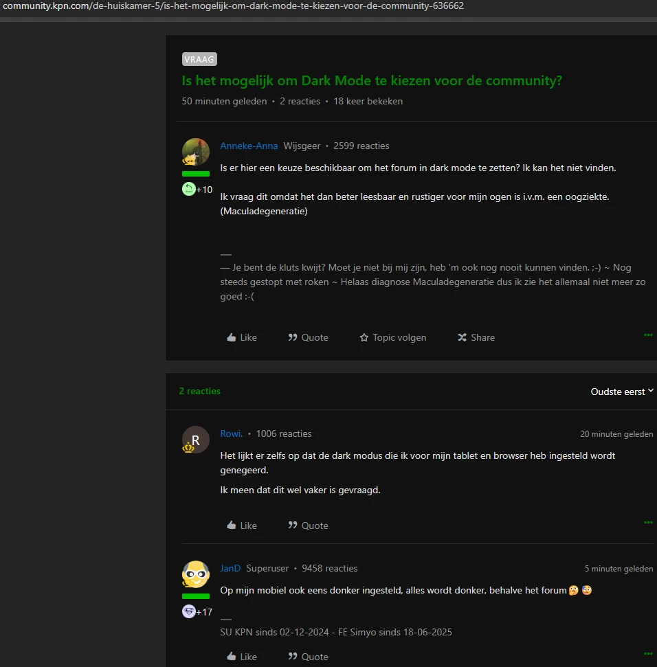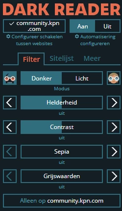 @Anneke-Anna Met Dark Reader kan je voor ieder website instellen. Met wachten op ondersteuning van KPN forum kan je beter je enkelkinderen overlaten.