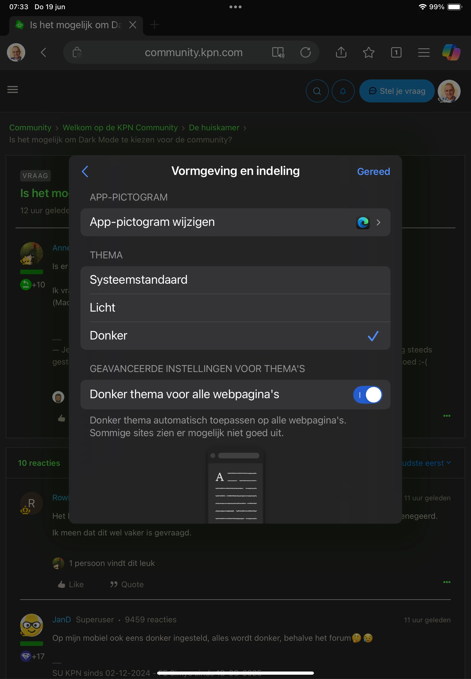 Met de browser Edge op mijn iPad gaat instellen naar dark mode websites heel eenvoudig.