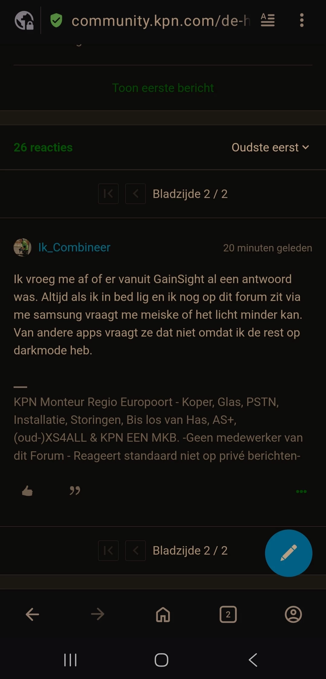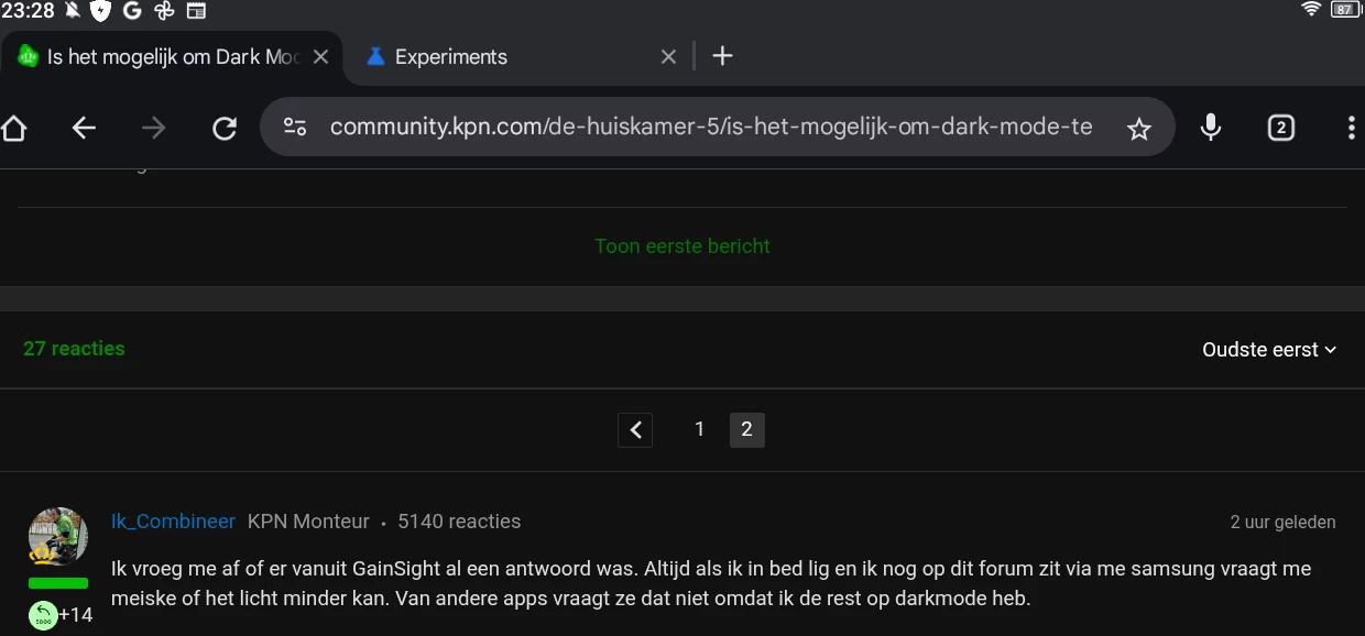 Ik vroeg me af of er vanuit GainSight al een antwoord was. Altijd als ik in bed lig en ik nog op dit forum zit via me samsung vraagt me meiske of het licht minder kan. Van andere apps vraagt ze dat niet omdat ik de rest op darkmode heb.