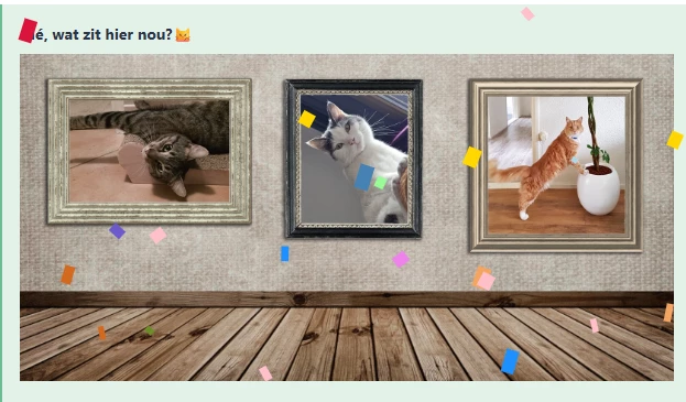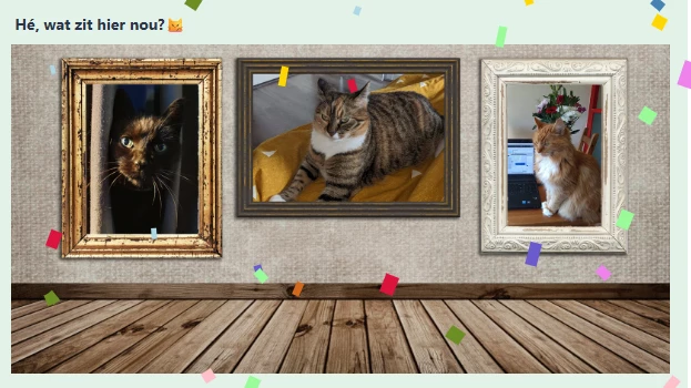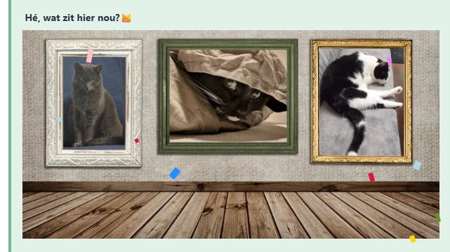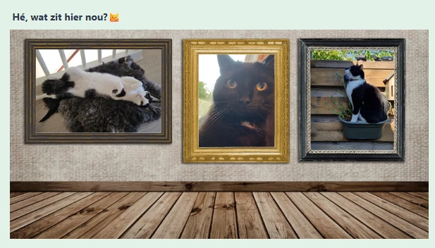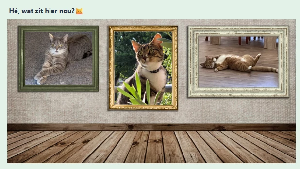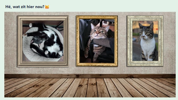 viel me op dat bij de drie kattenfoto’s deze tekst stond: Hé, wat zit hier nou?😼