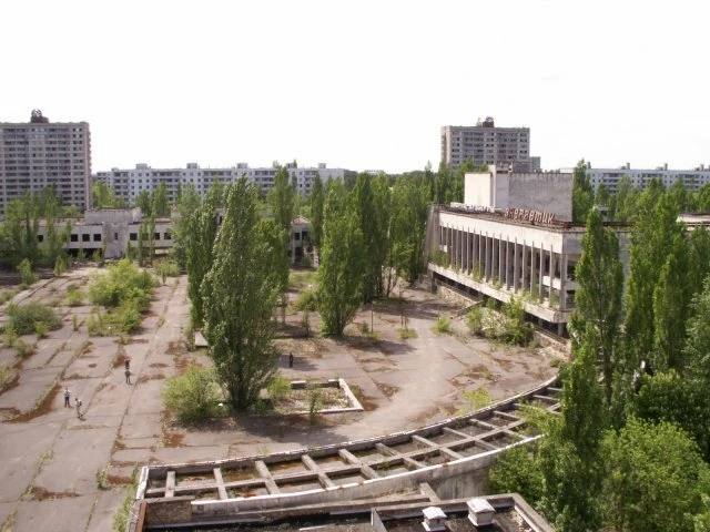 Jup, om precies te zijn is het het centrale plein van Prypyat, in de Chernobyl exclusion zone. Geen eigen foto want we mochten niet in dit gebouw vanwege instortingsgevaar, maar het is wel een mooi plaatje. Rechts is het gebouw waar de Sovjet partij gehuisvest was voor de ramp. Het hotel waar de fotograaf op staat was na de ramp de plek van waaruit de operatie gerund werd.