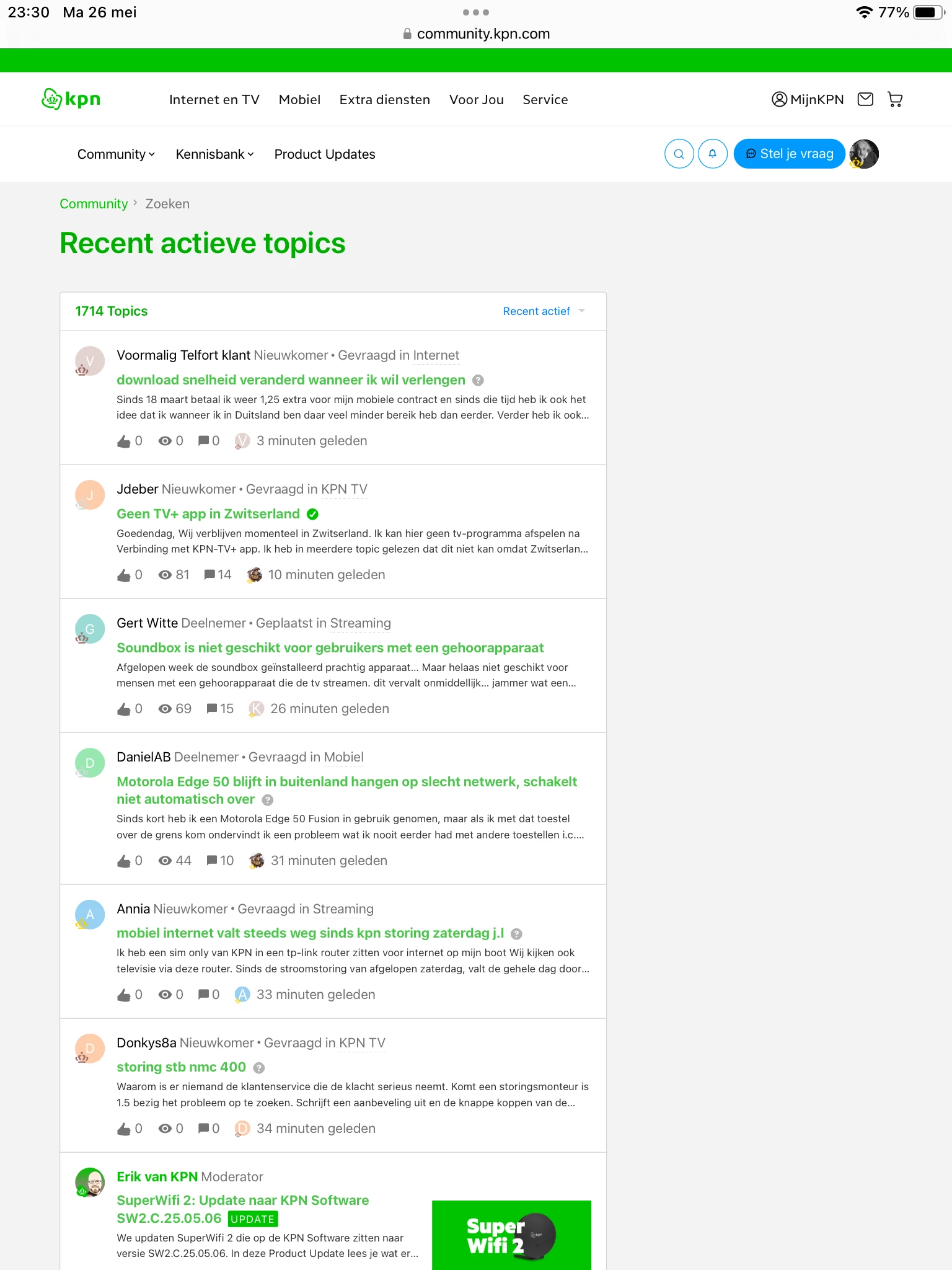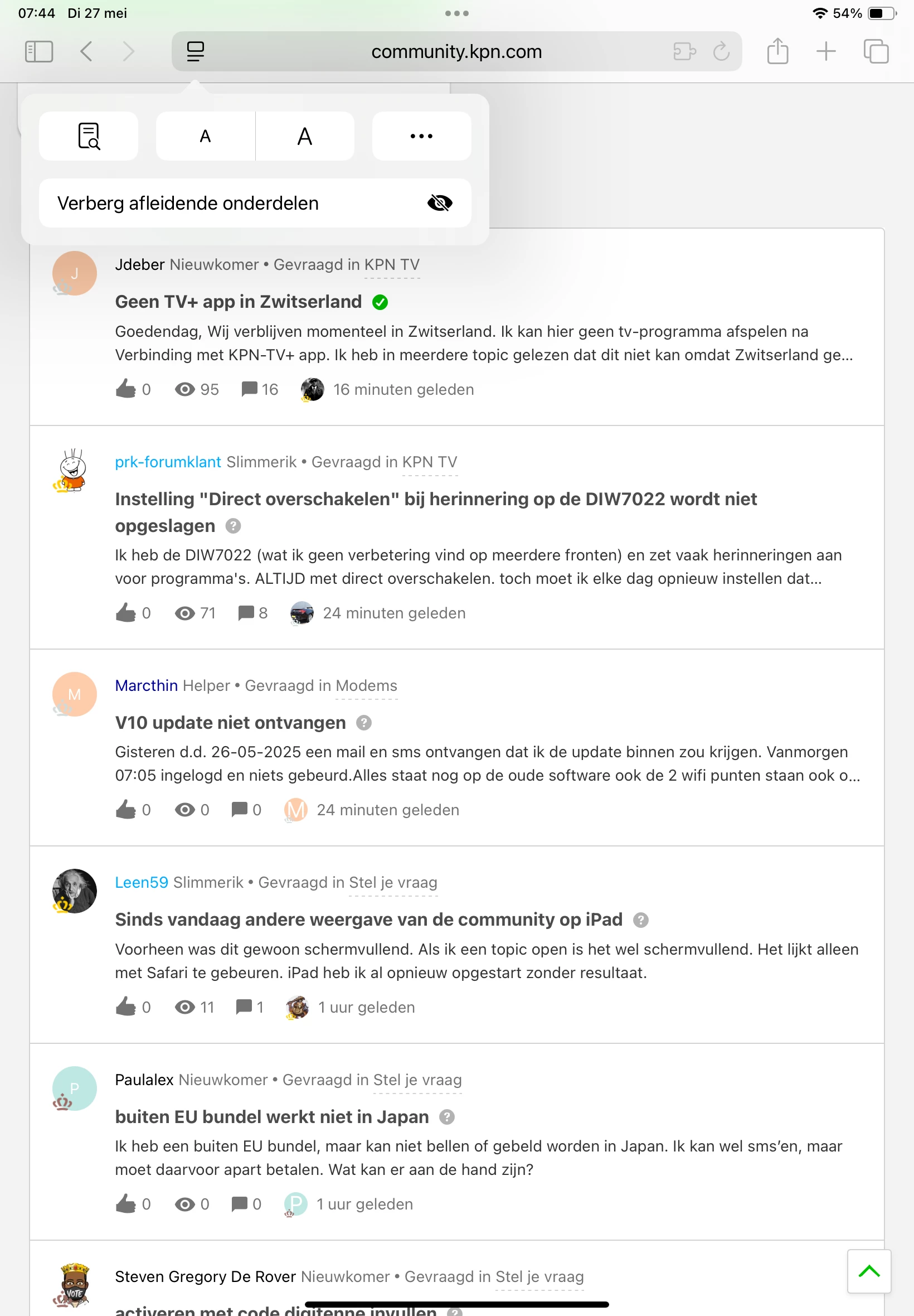 Ik heb hetzelfde probleem op de IPad zoals beschreven door ​@Leen59. Het heeft niet te maken met 100% zoom. Deze staat op 100% en bovendien alle andere pagina’s en websites zijn wel oké. Het vervelende is dat je maar 1 pagina ziet met recent actieve topics. Je kan niet naar pagina 2 , 3 etc. Je ziet onderaan die eerste pagina hetzelfde als beschreven door ​@TDN : een hele hoop paginanummers waar je verder niks mee kan. Helemaal naar rechts scrollen werkt niet op de IPad.