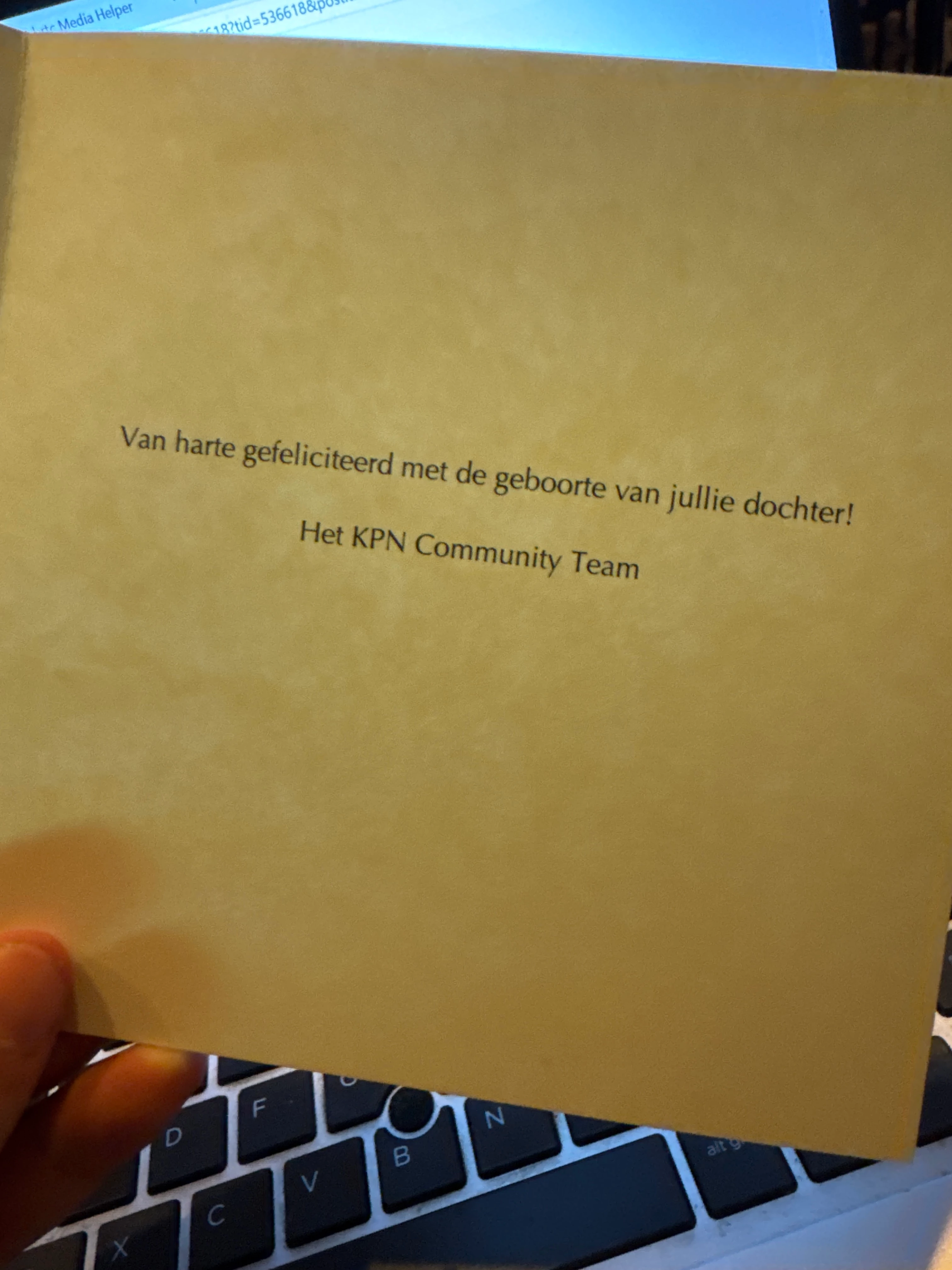 Dit ontzettend lieve kaartje van het KPN community team, met natuurlijk een bijpassend knuffeltje voor de kleine. Helaas niet in KPN groen 😉