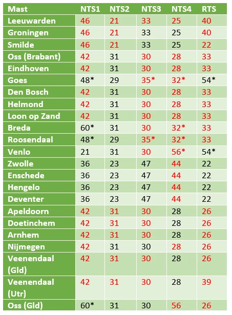 LET OP: De eerstvolgende frequentiewijzigingen vinden plaats op 21 mei. Op dat moment zullen we van de masten Eindhoven, Loon op Zand, Oss (Br), Den Bosch, en Helmond de frequentie van NTS1 en NTS4 wijzigen. Als je dan ook op een van deze masten zit en merkt dat je zenders mist na de 21e, scan even opnieuw voor zenders.