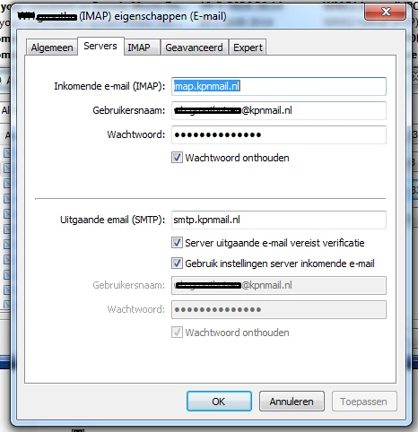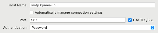 • Uitgaande server: smtp.kpnmail.nl (TLS aanvinken en poort 587 invullen)