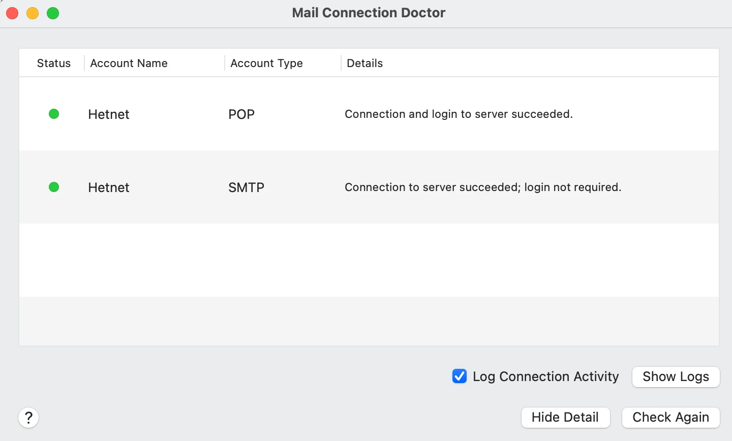 Krijg je helemaal geen foutmelding te zien? Je kunt in macOS Mail de logging aanzetten via de Connection Doctor.