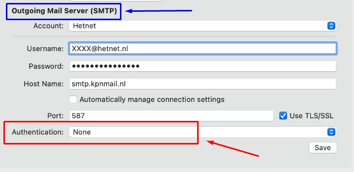 Helemaal onderaan heb je bij Authentication “None” staan. Dat moet zijn “wachtwoord” of “Password”, de Engelse term daarvoor.