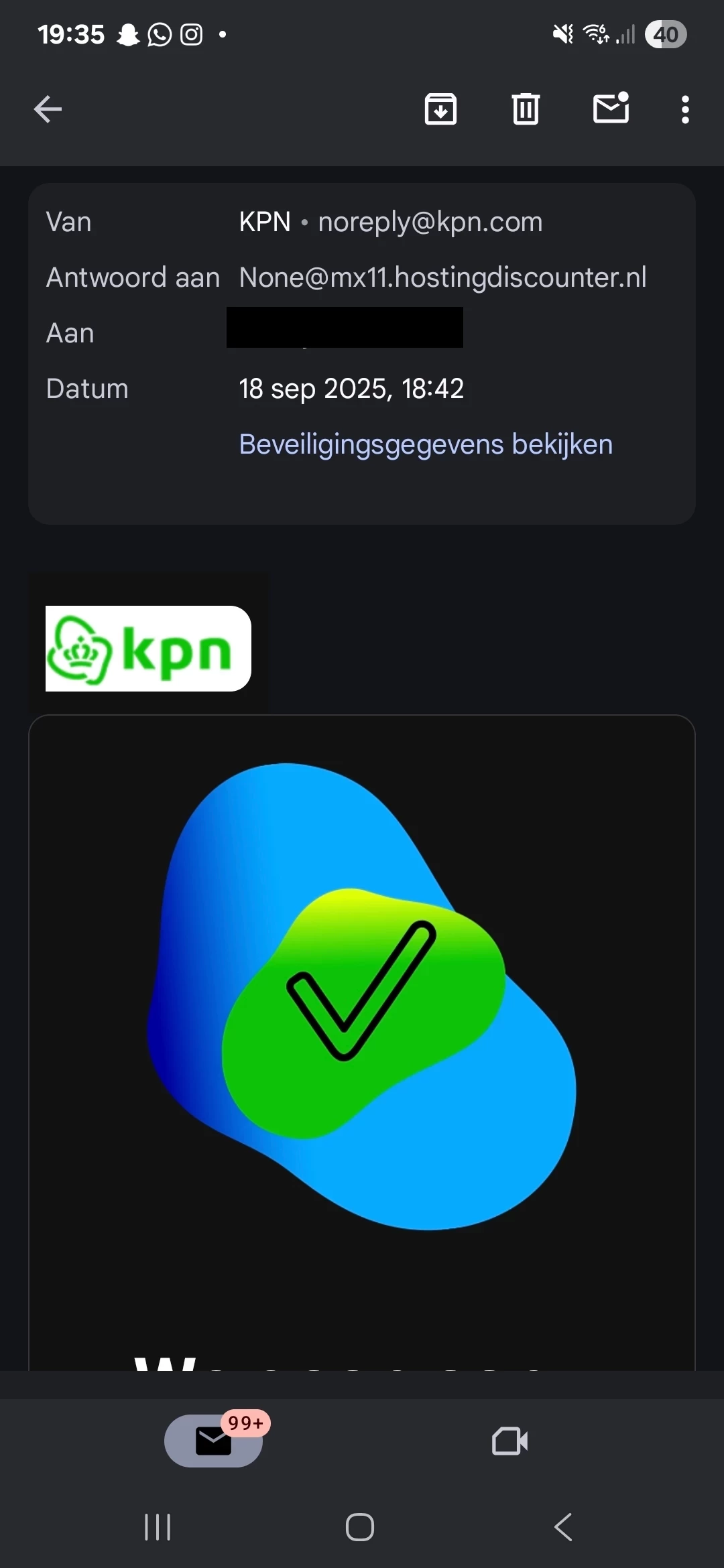 De afzender is noreply@kpn.com en dat e-mailadres gebruikt KPN vaker.