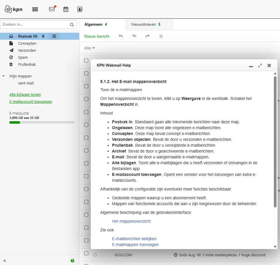 De KPN webmail help met het groene vraagteken onderaan het scherm vermeld wel een ongelezen mail map en nog veel meer mappen die in de KPN webmail niet zichtbaar zijn.