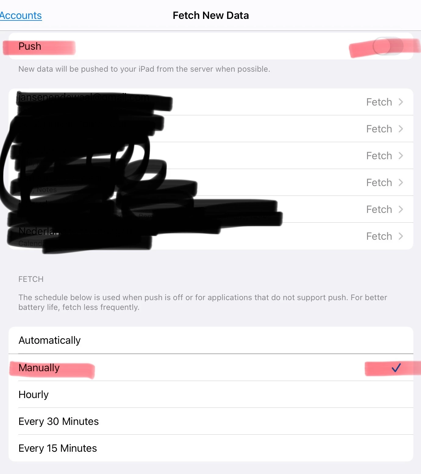 I heb nu mail checking veranderd van “push” naar “fetch”, met checking: “manually”. Ik ga er vanuit dat dan géén mailaccount meer wordt gebruikt zonder dat ik zélf nieuwe mail ophaal.