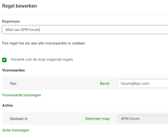 Ik heb in webmail submappen in mijn postvak in gemaakt. Ik zou graag regels instellen die bepaalde categorieën mail gelijk in een submap zetten. De enige verplaats optie die ik zie in de instelling is verplaats naar Postvak in.