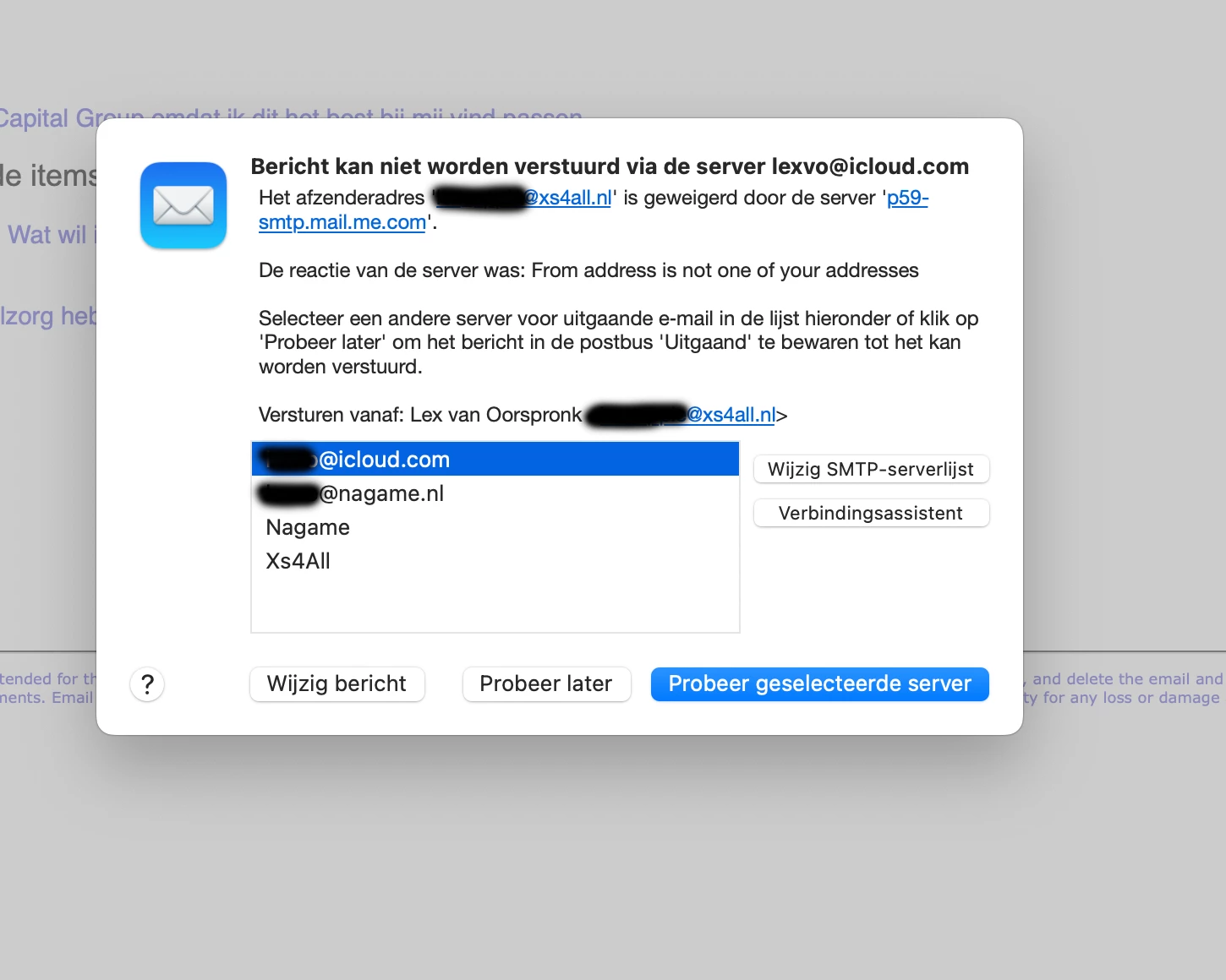Je hebt 4 smtp servers ingesteld. De email die je nu probeert te verzenden is een xs4all adres. Daarbij moet je de smtp server van kpn/xs4all gebruiken. Je gebruikt echter die van icloud. Dat is niet toegestaan.
