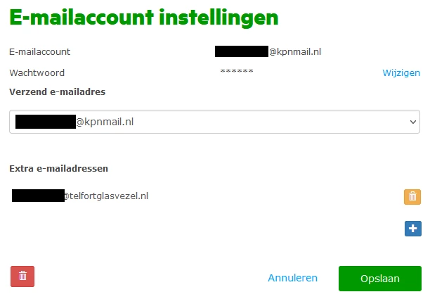Klik op je mail account na inloggen met je KPN ID en daarna kan je het telfortglasvezel.nl opnieuw aanmaken door op het blauwe plusje te klikken.