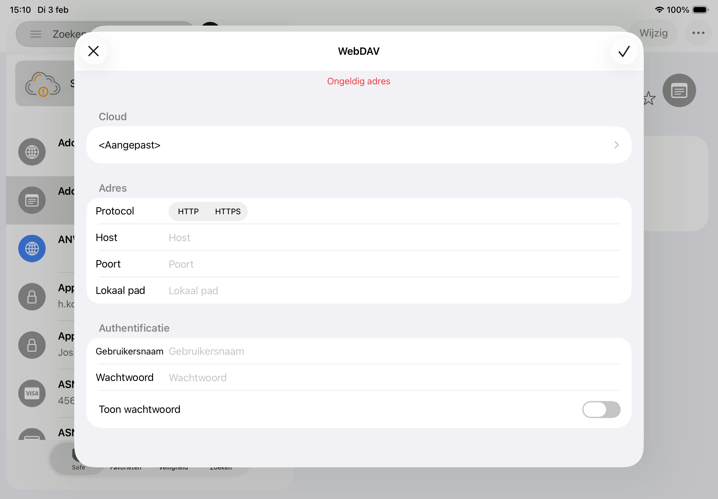 Wat moet er in de velden voor wachtwoord manager Safe in Cloud?