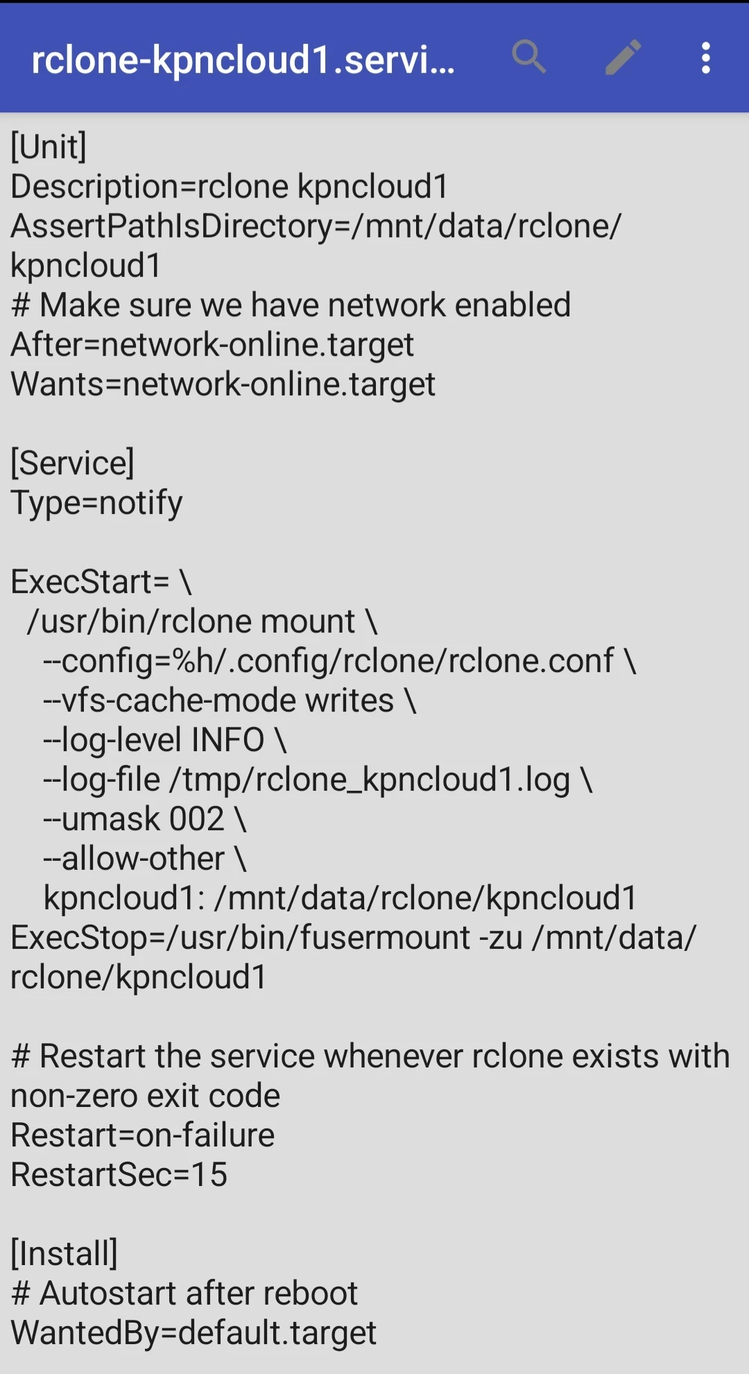 Helder, thanks! Dus jij draait rclone als systemd-service (rclone mount) zodat de KPN Cloud als “schijf” blijft hangen en wijzigingen direct syncen. Welke backend/URL gebruik jij precies voor KPN (WebDAV endpoint), en gebruik je nog specifieke flags (bijv. --vfs-cache-mode, --dir-cache-time, --poll-interval) om bewerken in-place stabiel te houden? (Ik krijg met curl op de WebDAV URL nog een 401, dus ik zoek de juiste endpoint + rclone instellingen.)