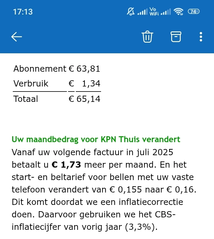 Jouw internet-abonnement van 52,50 wordt per medio juli 2025 verhoogd met 3,3%.
