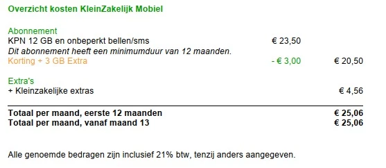 Zojuist een zakelijke e-sim-only abonnement afgesloten, maar de maandelijkse kosten komen niet overeen met het bedrag tijdens afsluiten. Zie onderstaande afbeelding.