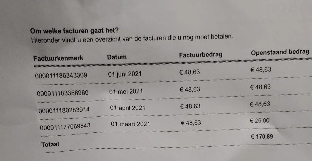 Ik heb telefonisch contact gehad met een medewerker en zij gaf aan dat het gaat om een  openstaande rekening van 2021. Ik had een bewindvoerder die mijn financiën beheerde tussen 26-08-2020 tot en 08-10-2025. Op 27 januari 2025 heb ik een brief van Kredietbank gekregen dat ik schuldenvrij ben. Dat betekent dat ik de schuldeiser(s) het eventuele resterende bedrag niet hoeft te betalen en dat de schuldeisers daar geen verdere actie op kunnen ondernemen. De behulpzame medewerker heeft alle facturen van 2021 opgestuurd, maar ik word er niet wijzer van. Misschien zie ik iets over het hoofd, maar ik kan geen schuld ontdekken.