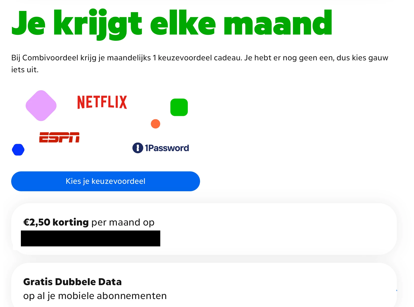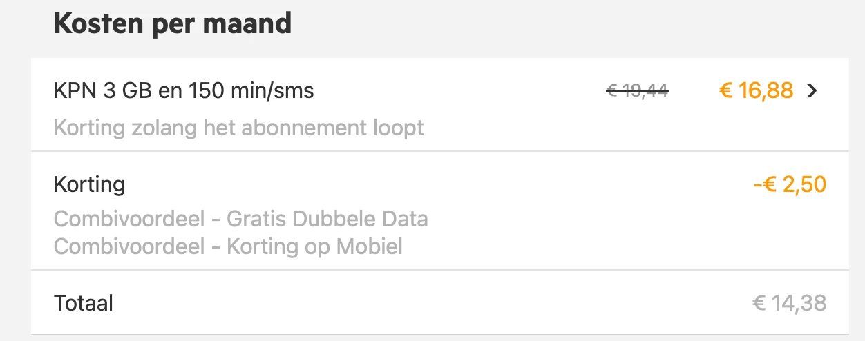 Dan lijkt het erop dat je jouw 2,50 euro korting vanwege Combivoordeel nog niet hebt geactiveerd. Er wordt nu dus de bruto prijs in rekening gebracht waar de korting nog niet van afgehaald is. Voor het aanmelden van jouw producten voor de voordelen van KPN Compleet of Combivoordeel (dat is afhankelijk van hoe oud jouw abonnementen zijn) kun je de voordelen zelf nakijken en aanzetten. Controleer eerst of de voordelen actief zijn via MijnKPN.