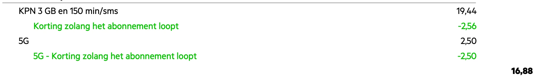 Jij hebt wel de afgesproken korting die door een prijsindexatie inmiddels van 2,50 is gestegen naar 2,56. Maar jij mist het Combivoordeel van 2,50 per maand. Dat krijg je echter alleen zolang je ook een thuisabonnement hebt bij KPN. Beide abonnementen (thuis en mobiel) moeten dan geregistreerd staan op hetzelfde adres.