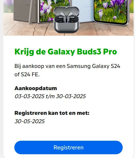 Ik zie namelijk alleen een actie voor de Samsung Galaxy S24 en S24 FE in die periode en daarbij kan je dan gratis de Galaxy Buds3 Pro krijgen.