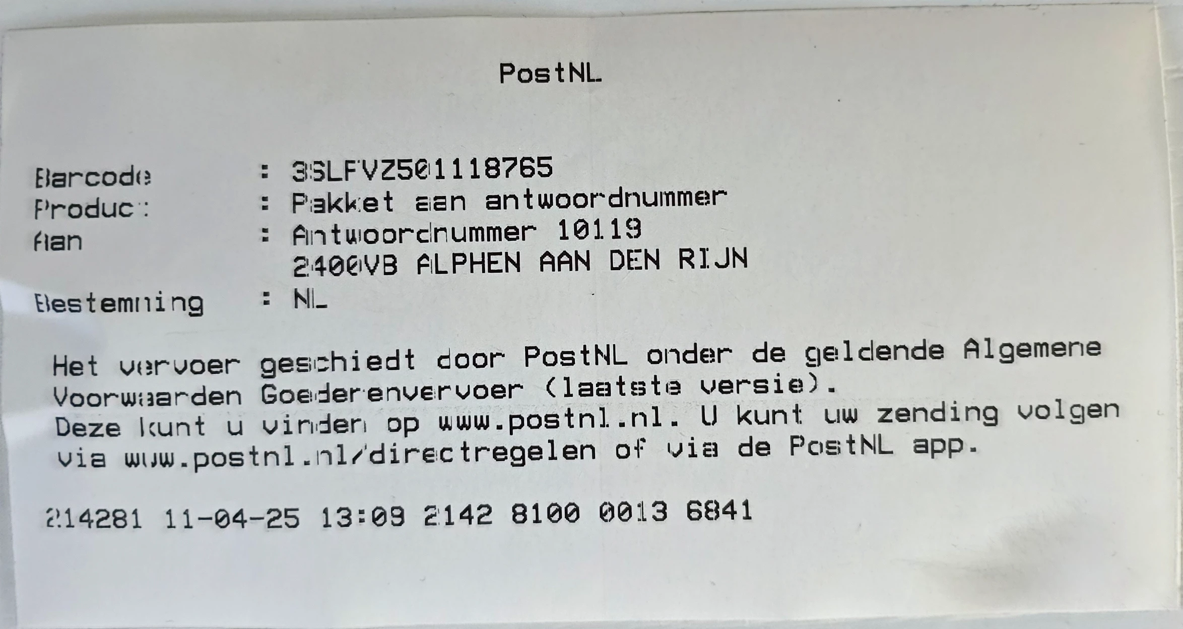 Ik wachtte dagenlang op de retourbox, maar die kwam nooit aan. Daarom heb ik hem zelf teruggestuurd. En wat een pech, want de retourdoos en de sticker zijn net aangekomen. Er staat niets op de doos dat van mij is, dus ik wilde proberen hem te vinden met deze postnl barcode.