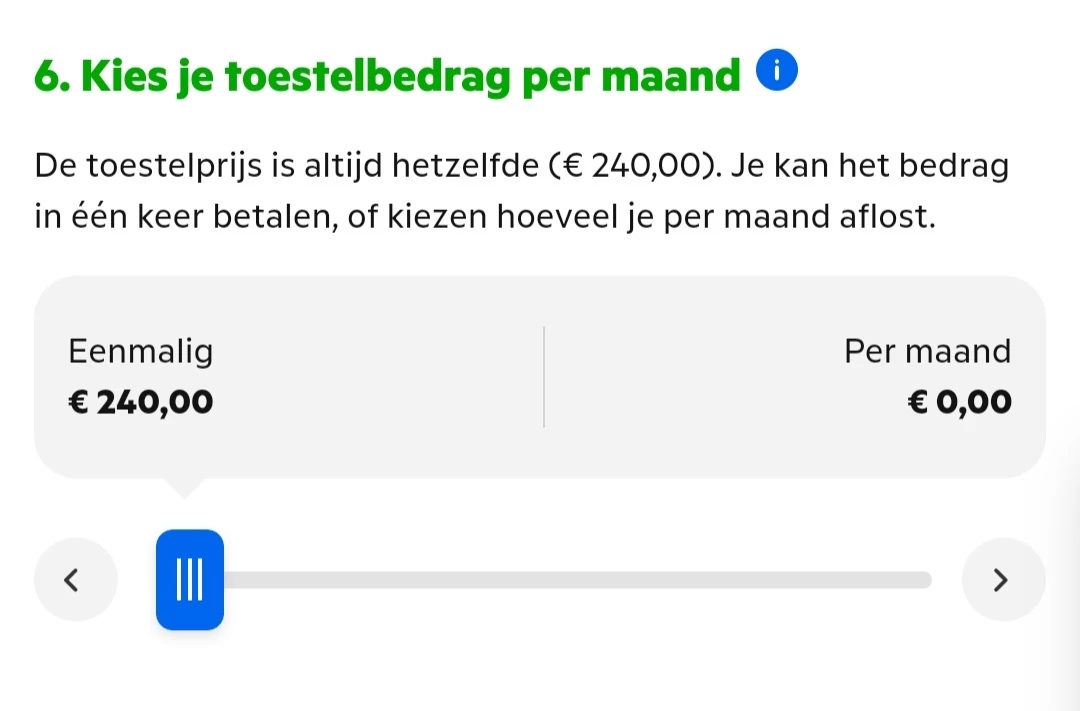 Waarom betaal je die toestellen niet gewoon volledig in 1 keer? Dat kan gewoon. Gewoon het schuifje helemaal naar links. Ben je overal vanaf.
