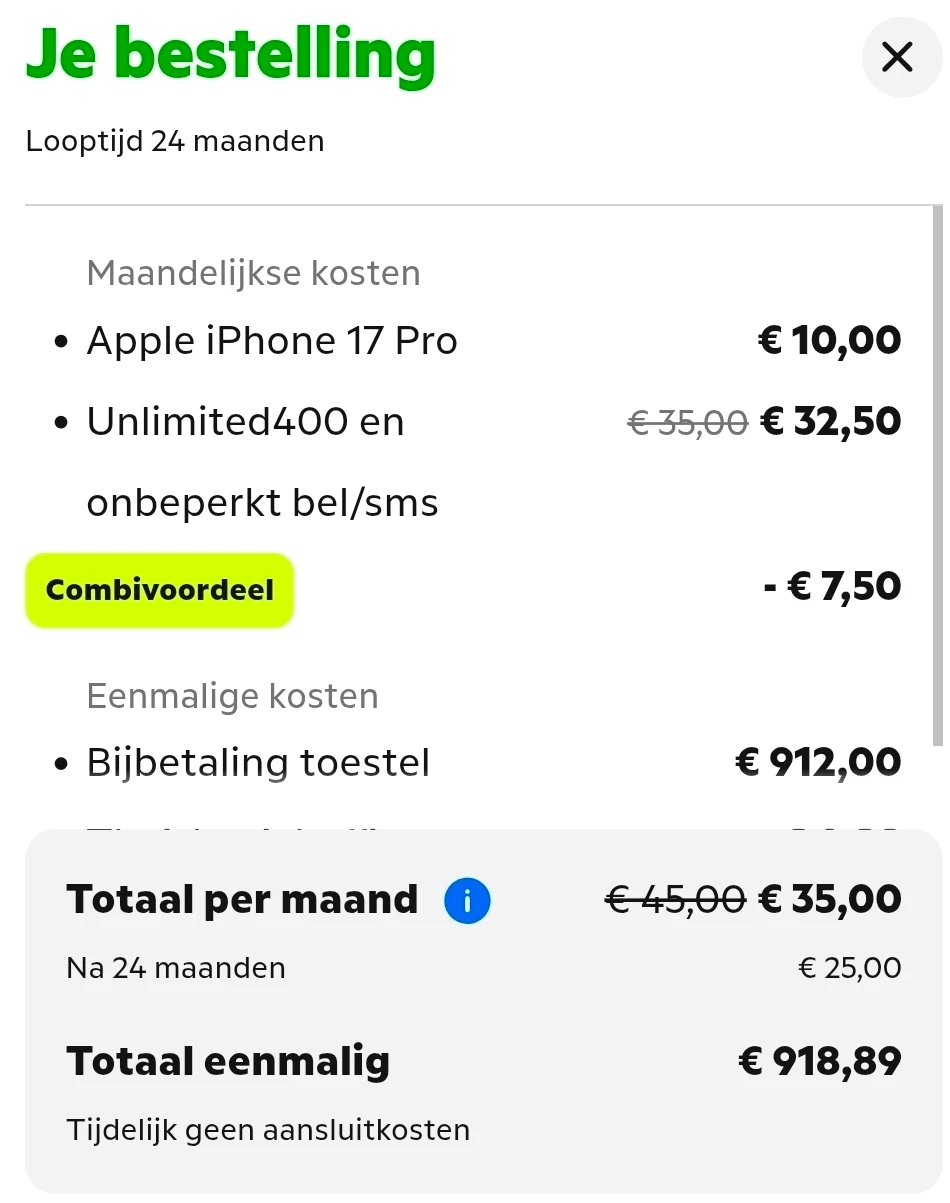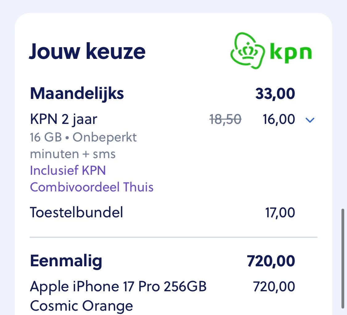 KPN heeft een snelpakker deal mbt Iphone 17 pro, voor 33 euro per maand. Bijbetaling toestel is 750 euro (eigenlijk overal dezelfde prijs, niet echt een deal).