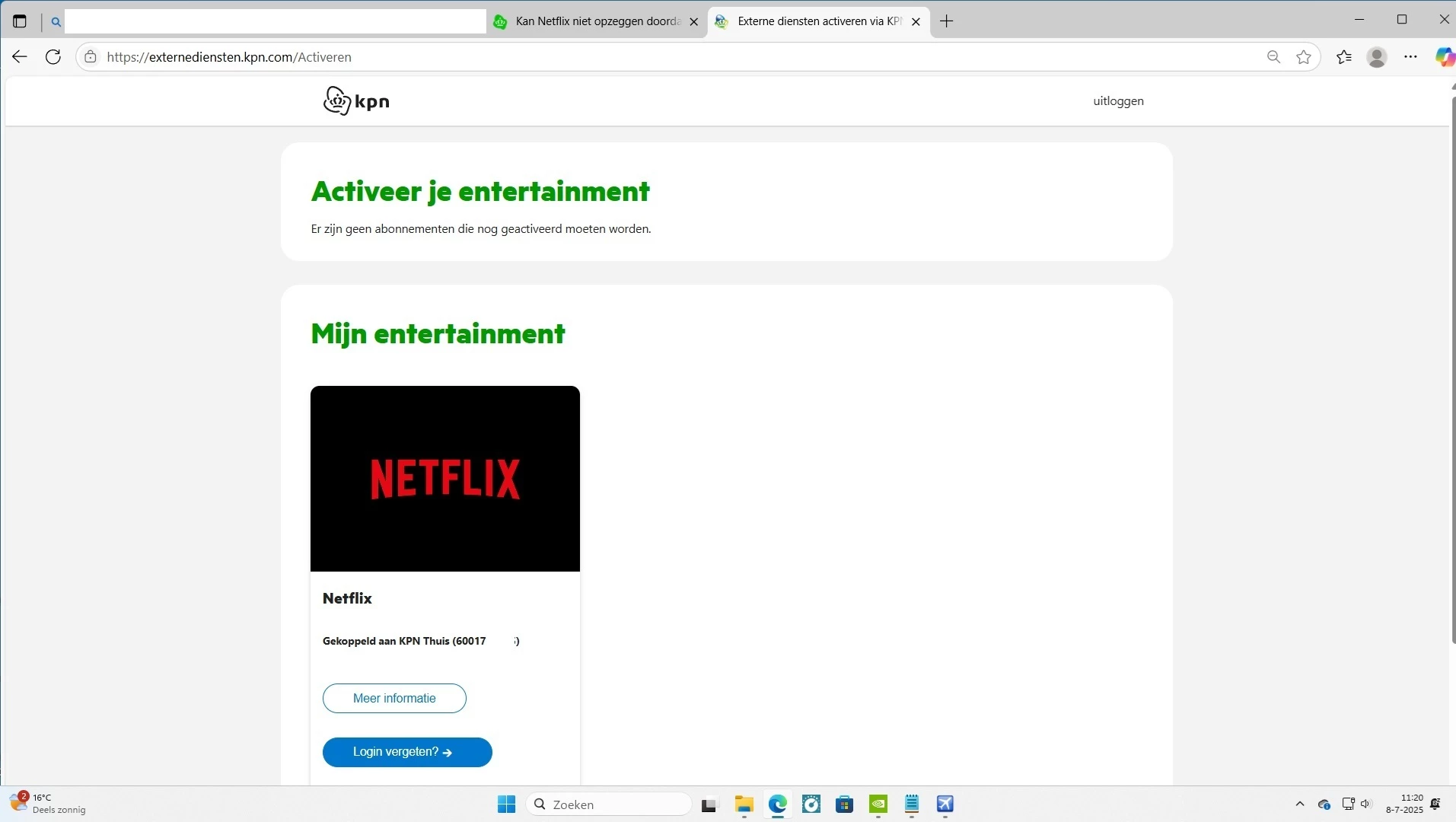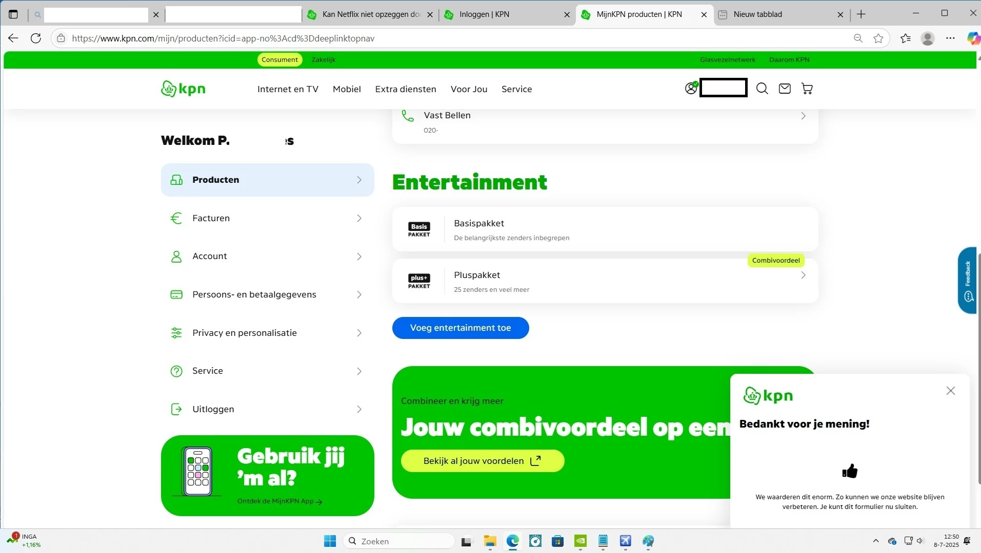 Beste Denise, hoeraaaa!!!  het lijkt erop dat bij ‘mijn Produkten’ de Netflix nu bij Entertainment inderdaad verdwenen is.  😀  Nu even de volgende factuur afwachten en als het blijft zoals het er nu uitziet alvast nu dank aan alle KPN support medewerkers voor maximale service.  Ik blijf wel even nadenken over hoe dit nou precies gekomen en of ik ergens (Netflix) nog kan navragen waarom ik nou al die tijd dit heb moeten betalen, helemaal omdat sinds Feb 2023 ik iedere maand tussen de  € 15,00  en € 18,99  heb betaald terwijl nu op de KPN Entertainment staat: NETFLIX voor €  8,99  ??  Ik snap steeds minder van……. met vr groet  Piet