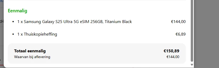 Het is eenmalig op de eerstvolgende factuur 144 + 6,89 thuiskopieheffing en daarna is de rest maandelijks het afgesproken tarief.Â