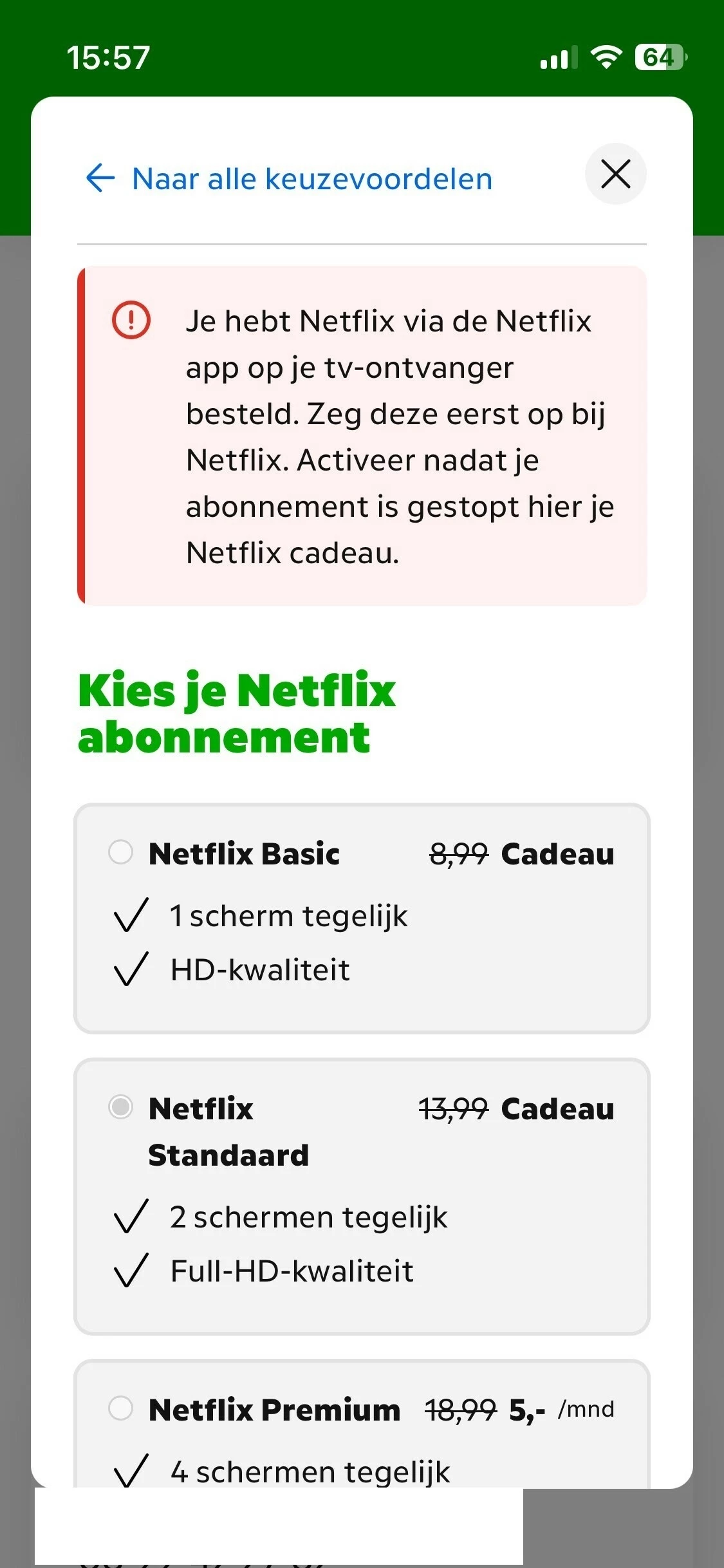 Het kiezen van Netflix als keuzevoordeel is heel recent veranderd en verbeterd. Het is nu niet meer nodig om Netflix eerst zelf op te zeggen. Wat gebeurt er als je het nu opnieuw probeert en Netflix als jouw keuzevoordeel kiest? Lukt het nu wel?