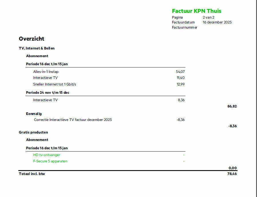 Heb je de vorige factuur er al naastgelegd? Laat daar ook eens een afdruk van zien. Ik vermoed dat daarop “Interactieve TV” niet apart vermeld werd. Waarschijnlijk stond achter Alles-in-1 Instap een hoger bedrag en was TV daar in opgenomen. Rond eind november heeft KPN ingevoerd dat de TV optie apart zichtbaar wordt op de factuur. Bij jou is dat waarschijlijk op 25 november ingevoerd. De correctie op de nieuwe factuur is dan alleen puur administratief om dit zichtbaar te maken. Als het goed is heeft daar op de factuur van november een bericht over gestaan.