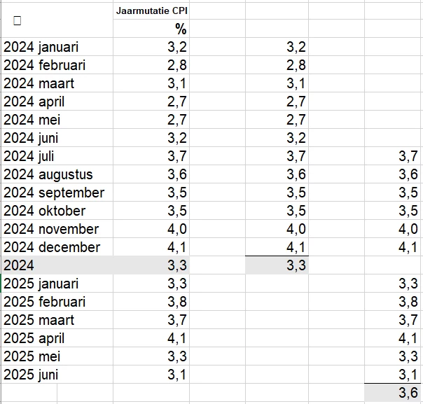 De 3,1% is alleen de stijging van de consumentenprijsindex (CPI) van juni 2024 vergeleken met juni 2025. Er zijn twaalf maanden in een jaar, die tellen allemaal mee.