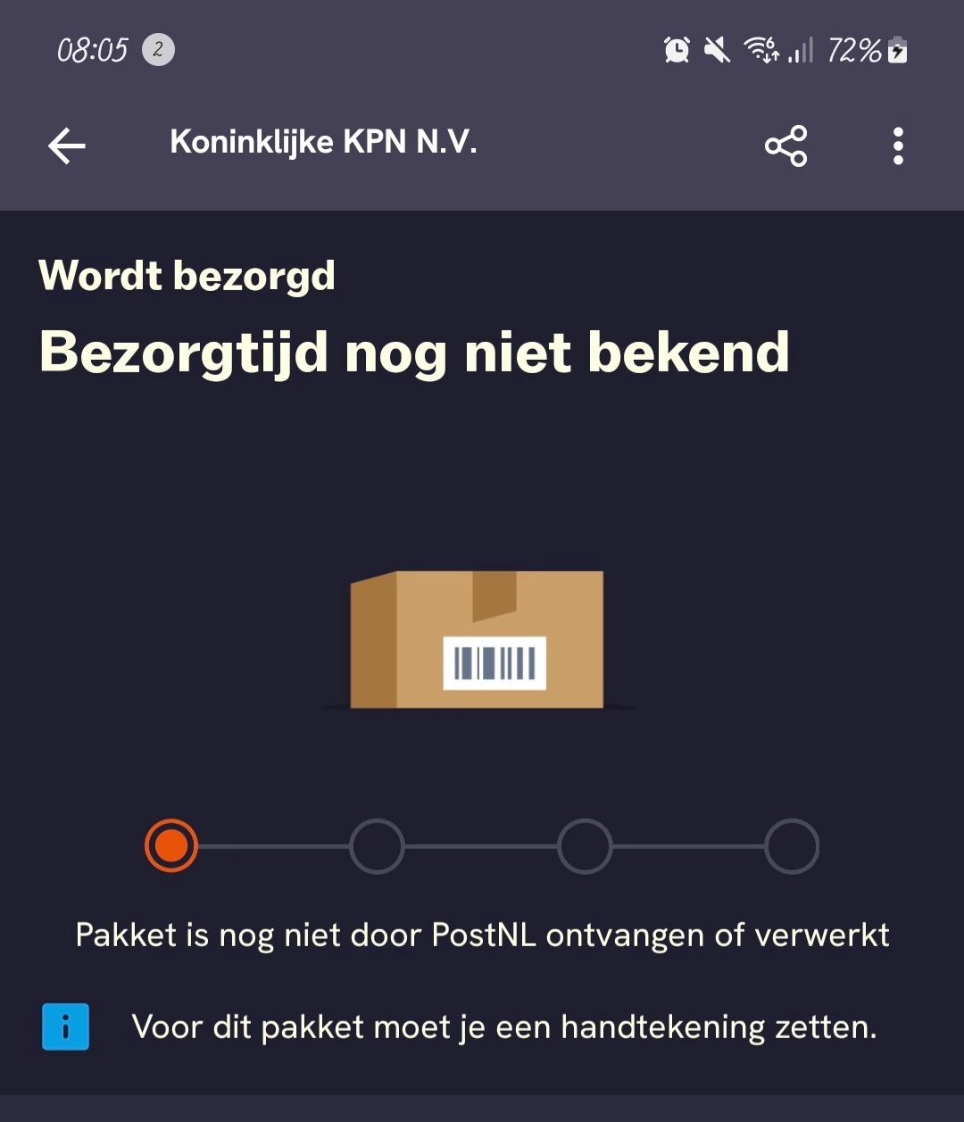 Alleen blijft het van 30 januari tot nu in de postnl app, dat het pakket nog niet ontvangen en of verwerkt is door postnl!