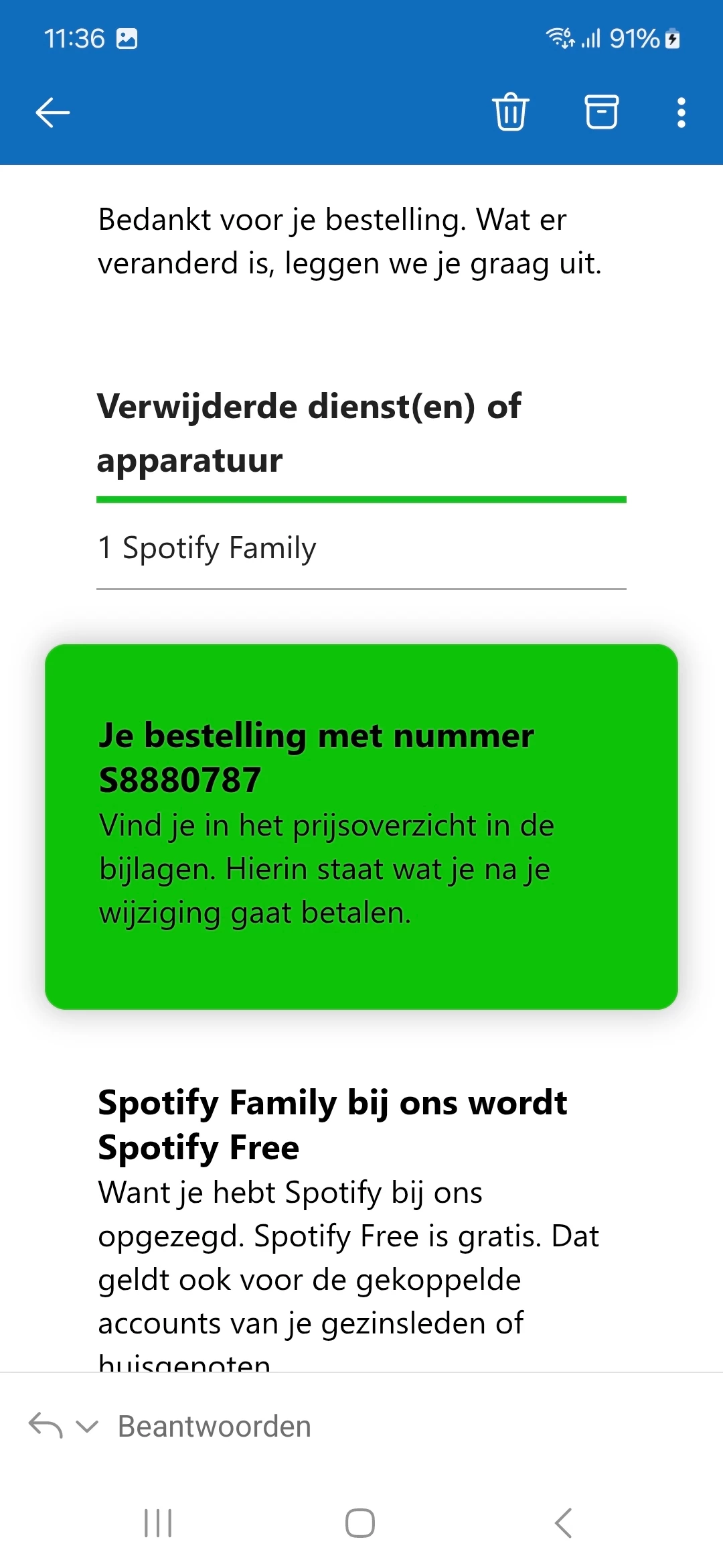 Nu zag ik dat op mijn factuur van 23 mei Spotify in rekening was gebracht. Hierop weer gebeld. Nu kreeg ik het antwoord dat er één maand opzegtermijn was. En dat het abonnement (waarschijnlijk) per 7 juni niet meer te gebruiken is.