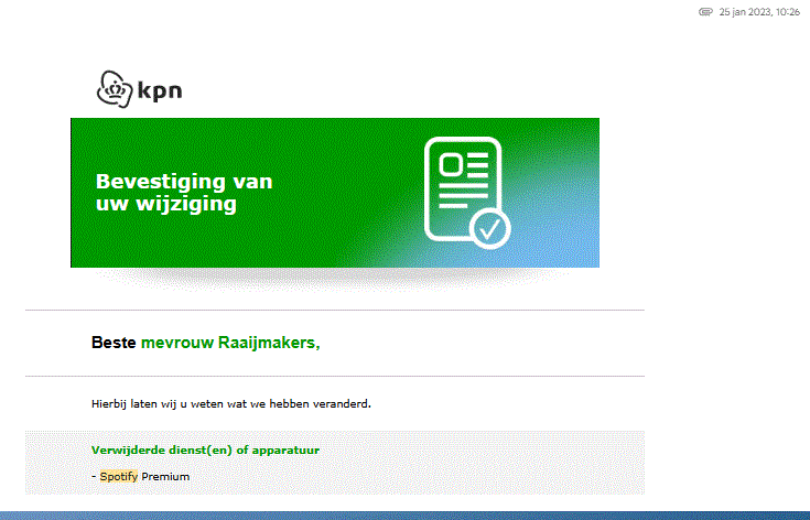 Hoi ​@jraaijma. Welkom op de KPN Community! Je bent aan het juiste adres om dit op te lossen. Wel vervelend en vreemd dat in 2023 Spotify Premium niet is beeindigd zoals dat wel aan jou bevestigd is.Â