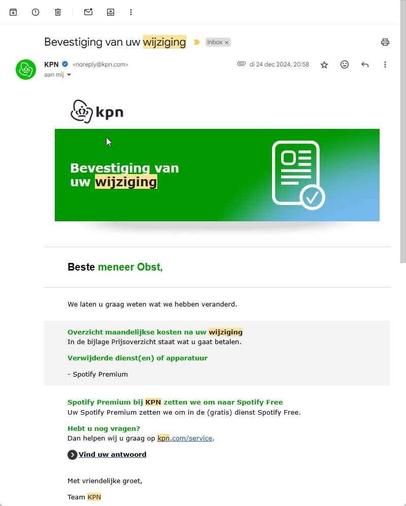 Ik heb op 24 December Spotify Premium van mijn Mobiel Abonnement verwijdert via de MijnKPN app. Ik heb hier een bevestigings email van gekregen. Maar dit staat nogsteeds elke maand op mijn factuur.
