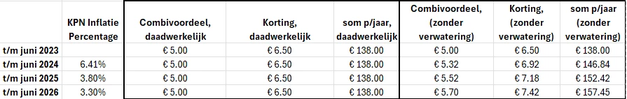 Gezien de jaarlijkse prijsverhogingen die KPN doorvoert op basis van inflatiecorrecties (6,4% effectief vanaf juli 2023, 3,8% effectief vanaf juli 2024 en 3,3% effectief vanaf juli 2025), ontstaat er naar mijn mening een vorm van verwatering van het voordeel voor trouwe klanten. De relatieve waarde van de korting neemt immers af, terwijl de abonnementskosten stijgen.
