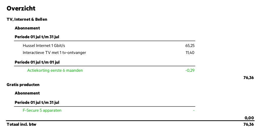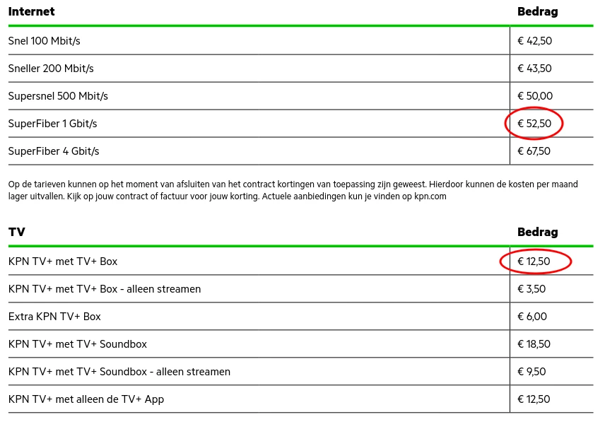 Als ik kijk bij de tarieven die sinds 1 april zijn ingegaan zou ik € 52,50 voor 1 Gbit moeten betalen en € 12,50 voor de TV box, samen dus € 65.
